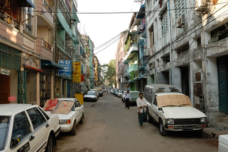 Een straat scene in het centrum van Yangon, de hoofdstad van Myanmar |